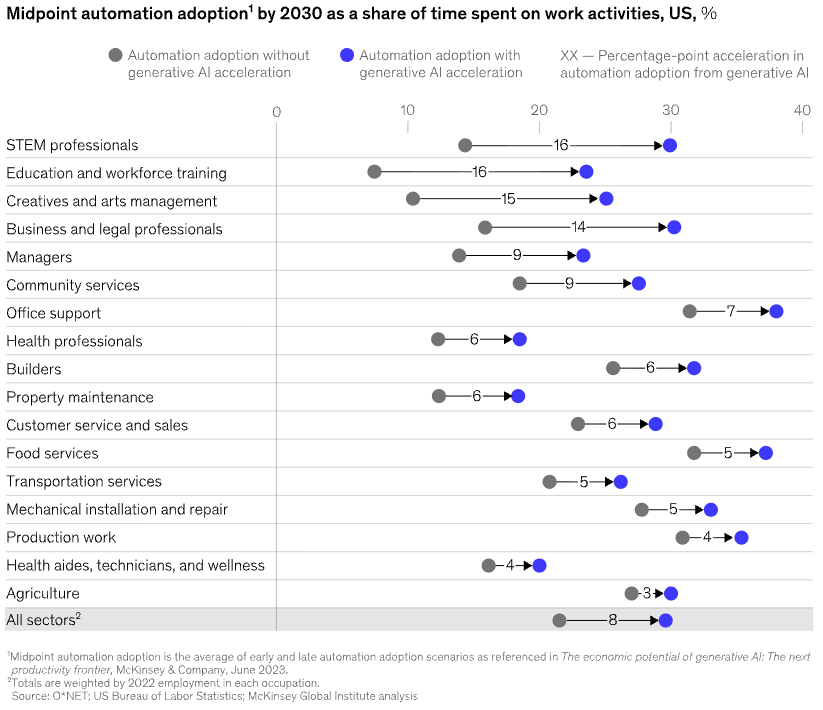 Laut einer McKinsey-Studie kann generative KI die Produktivität in Industrieländern bis 2030 um bis zu 0,9 Prozentpunkte jährlich steigern (mckinsey.com).